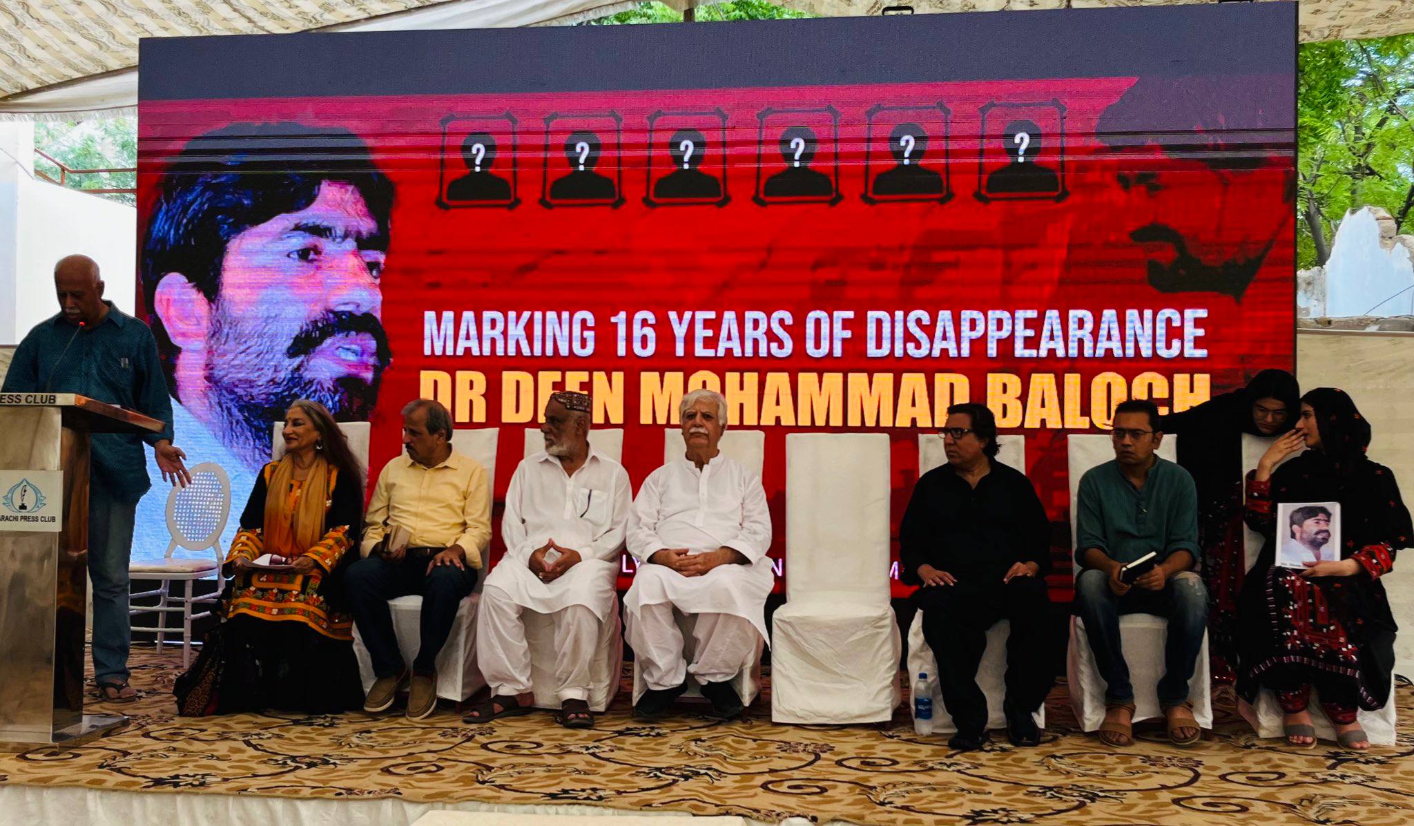 کراچی: بلوچ سیاسی رہنما اور جبری گمشدگی کا شکار بلوچستان نیشنل موومنٹ (بی این ایم) کے رہنما ڈاکٹر دین محمد بلوچ کی گمشدگی کو 16 سال مکمل ہونے پر کراچی پریس کلب میں ’ڈاکٹر دین محمد بلوچ کے بغیر 16 سال‘‘ کے عنوان سے ایک سیمینار کا انعقاد کیا گیا۔ یہ سیمینار اتوار کے روز منعقد ہوا جس میں بڑی تعداد میں صحافیوں، وکلا، انسانی حقوق کے کارکنان، سول سوسائٹی کے نمائندوں اور جبری لاپتہ افراد کے لواحقین نے شرکت کی۔