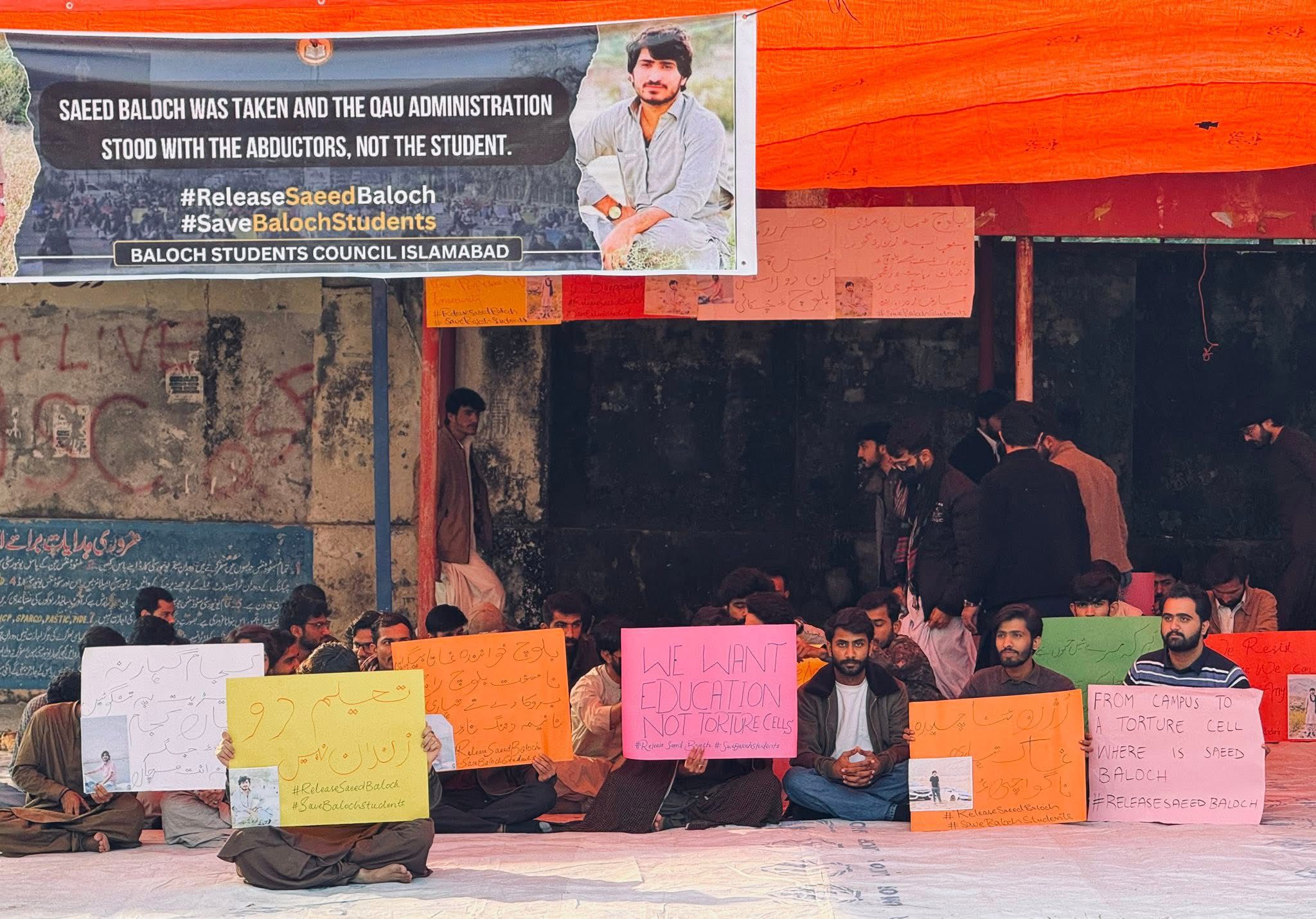 اسلام آباد — قائداعظم یونیورسٹی اسلام آباد میں بلوچ طلبہ نے جبری گمشدہ طالب علم سعید بلوچ کی بازیابی اور ہراسانی کے بڑھتے واقعات کے خلاف احتجاجی دھرنا ایک بار پھر شروع کر دیا ہے۔ بلوچ اسٹوڈنٹس کونسل نے واضح کیا ہے کہ مطالبات کی منظوری تک احتجاج جاری رہے گا اور یونیورسٹی کو غیر معینہ مدت تک بند رکھنے کی حکمت عملی اپنائی جا سکتی ہے۔